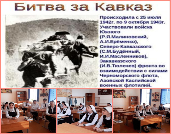 Классные руководители провели классные часы и беседы: «Битва за Кавказ», «Защитникам перевалов Кавказа посвящается…», «Давно закончилась война», Библиотечный урок «Мы помним!» провела зав. Библиотекой Ветригова Н.А. с обучающимися 5-ых классов.
