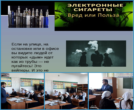 Во исполнение протокольного поручения Главы Чеченской Республики Р.А. Кадырова № 01-18 от 24.09.2019г. в части касающейся (пункта 4) проведены классные часы и беседы, по профилактике курения электронных сигарет.