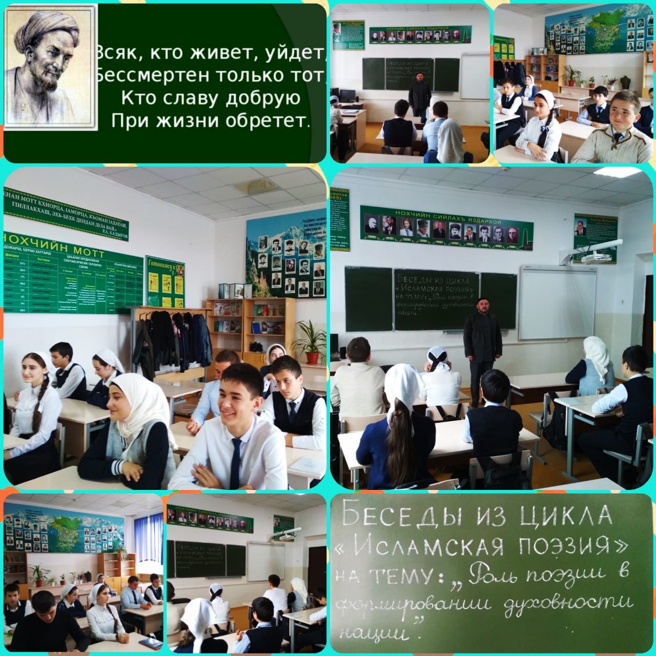 Беседа из цикла "Исламская поэзия" в 8 "А" классе. Проводит Хажмурзаев Х.Х. - педагог-организатор ДНВиР.