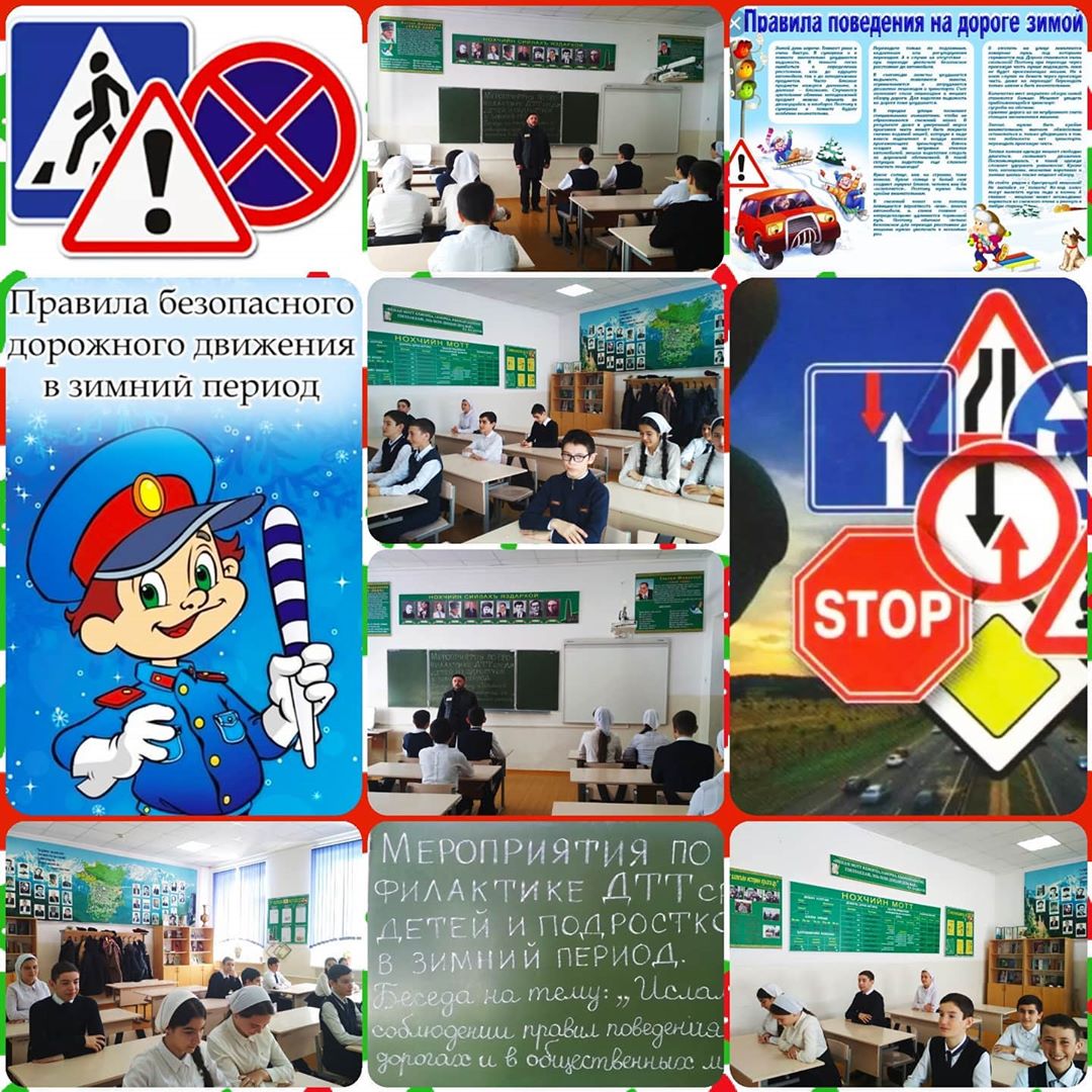 Мероприятия, проводимые в рамках исполнения протокольных поручений Главы ЧР Р.А. Кадырова и реализации ЕК ДНВиР подрастающего поколения, по профилактике дорожно-транспортного травматизма среди детей и подростков в зимний период.Беседы на тему: "Ислам о соблюдении правил поведения на дорогах и в общественных местах".Педагог-организатор по ДНВиР - Хажмурзаев Х.Х.