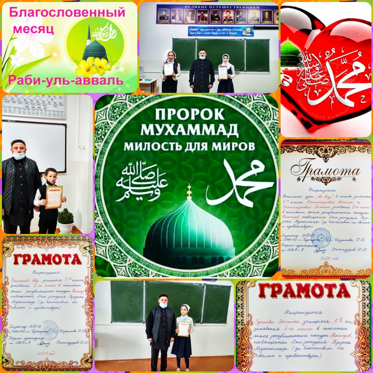 10.11.2020Победителям и призёрам школьного этапа республиканского конкурса нашидов, посвящённого Дню рождения Пророка Мухаммада (мир ему и благословение Аллаха) были вручены грамоты: