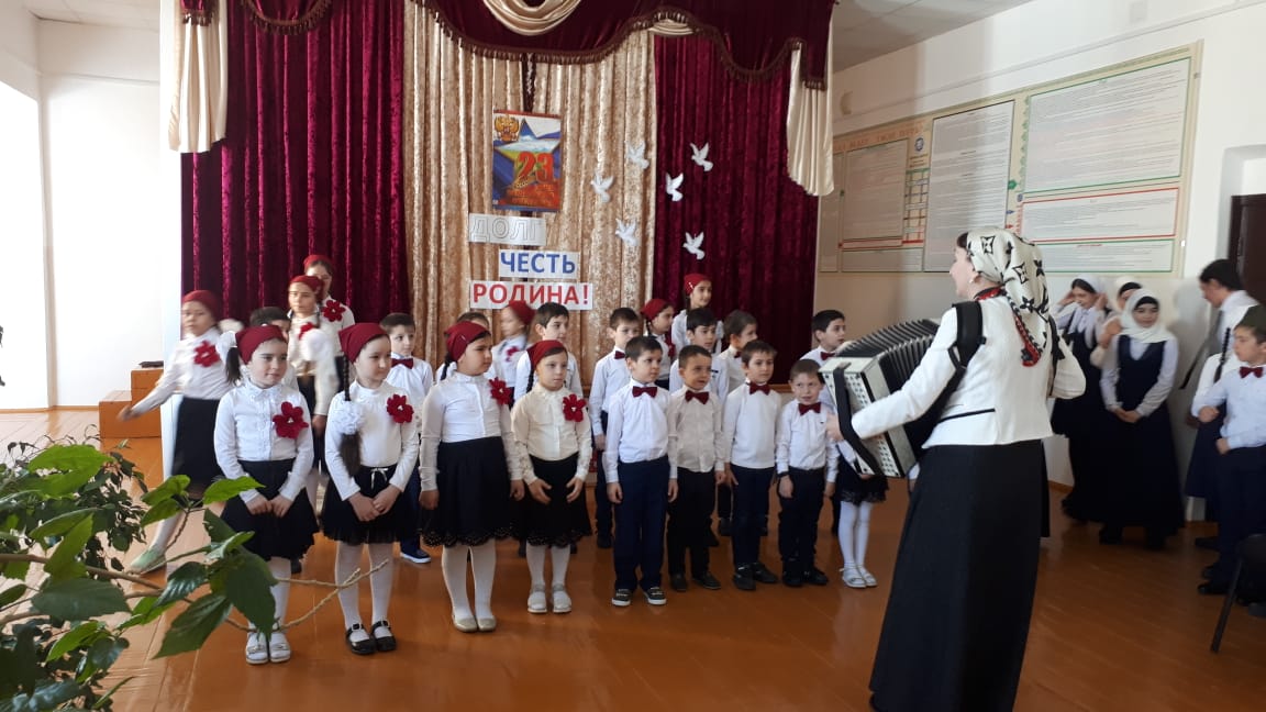 Итогом тематической недели "День защитника Отечества" стало общешкольное мероприятие "Долг! Честь! Родина!", где юные хористы вместе с руководителем хора заслуженной артисткой Чеченской Республики Белаевой А.А. исполнили песни, танцы, стихотворения, посвященные "Дню защитника Отечества".