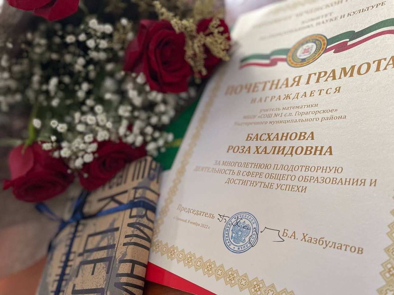 Профессия учителя всегда остается самой почетной, но, в то же время, и самой трудной. Сегодня хочется рассказать об удивительном педагоге с 29 летним стажем работы - Басхановой Розе Халидовне. Если задать вопрос выпускникам МБОУ "СОШ №1 с.п. Горагорское", кто был вашим любимым учителем, то ответ у многих будет такой: "Мой любимый учитель - Роза Халидовна". Наверное, не каждому повезло изучать сложный предмет математики на одном дыхании. Уроки Розы Халидовны отличаются высокой плотностью, строгой дисциплиной, кропотливой работой над разгадкой самой трудной задачки. Администрация школы поручает ей не самые простые классы, так как никто не сомневается, что она непременно справится. Сколько душевных сил и энергии отдала она своим ученикам, научив их правильно и просто разбираться в математических законах. Говоря о Розе Халидовне, нельзя не отметить ее личных качеств: сдержанность и доброту, трудолюбие и бескорыстие. За свой труд педагог не раз была отмечена грамотами отдела образования администрации Надтеречного муниципального района, грамотами Министерства образования и науки Чеченской Республики. Сегодня 9 ноября 2022 году Роза Халидовна награждена почетной грамотой Парламента Чеченской Республики, за многолетнюю плодотворную деятельность в сфере общего образования и достигнутые успехи.