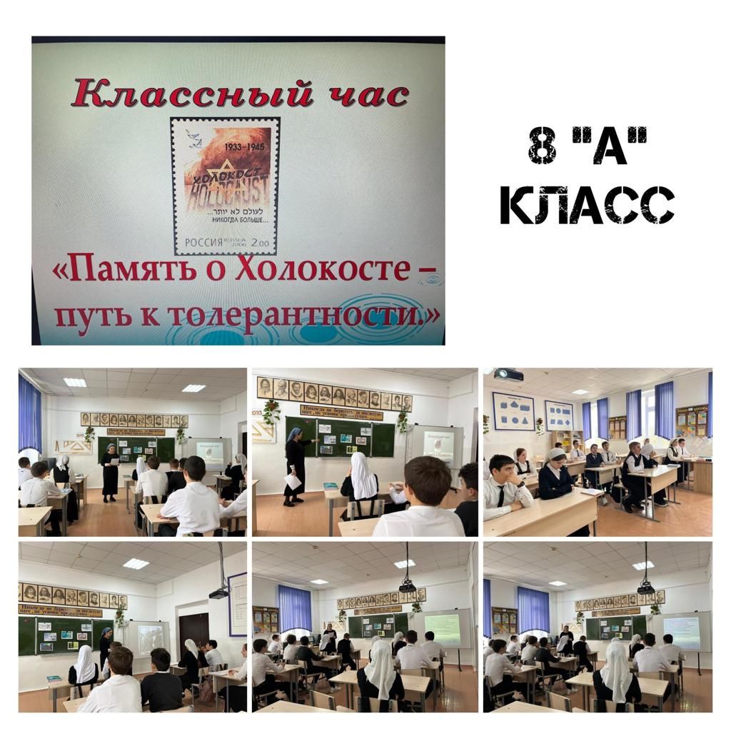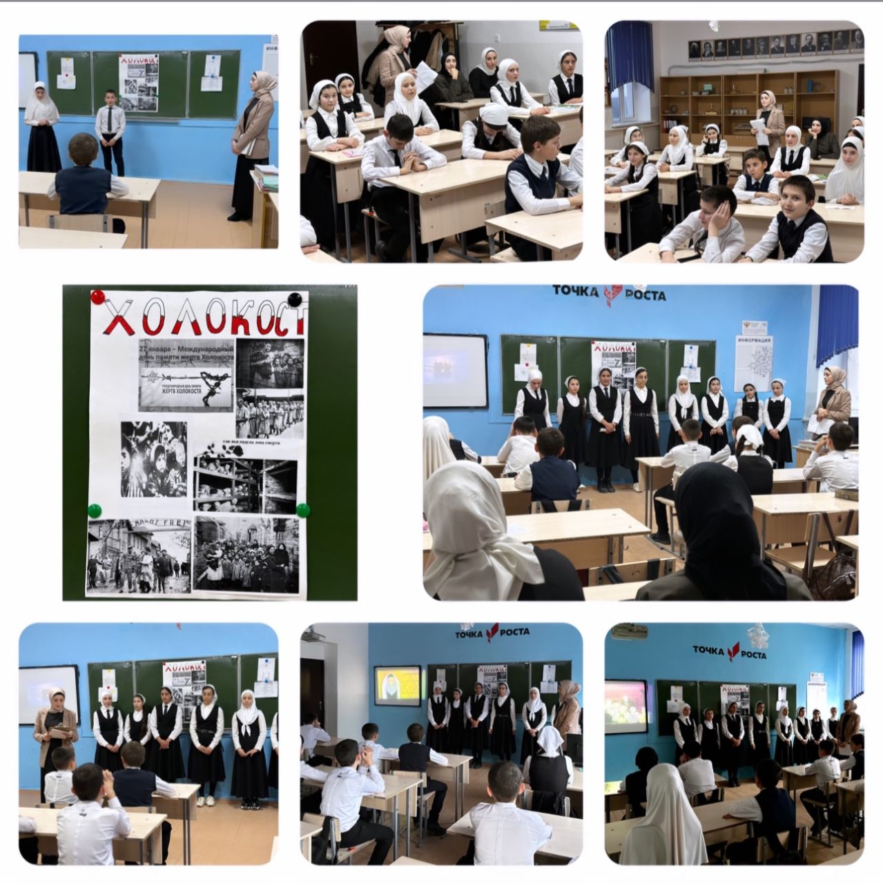 Классные руководители 6 "А" класса Аслаханова М. М., 8 "А" класса Басханова Э. В. провели классные часы, посвящённые Международному Дню памяти жертв Холокоста. Цель: воспитания гражданственности и формирования межнациональной терпимости, понимание обучающимися трагического события Второй мировой войны, вошедшего в историю под названием Холокост.