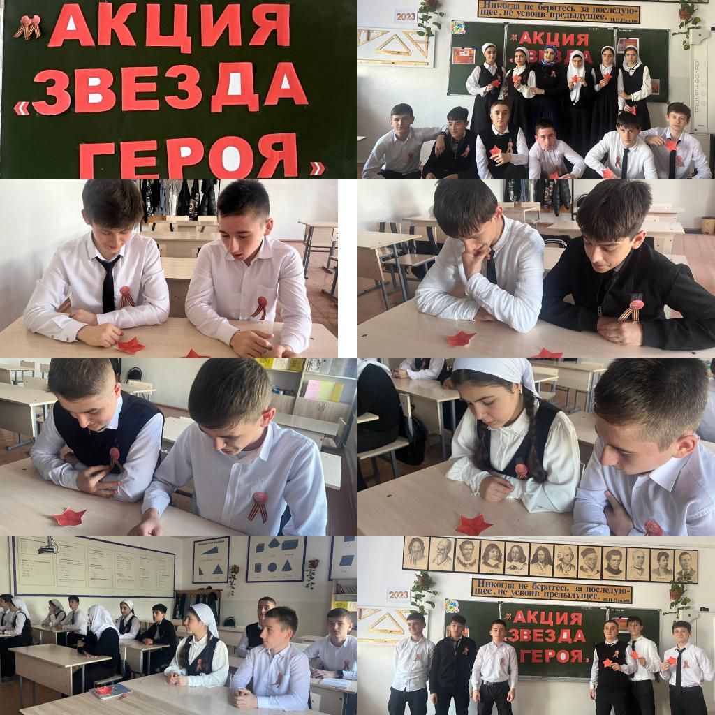28.04.2023В преддверии наступающего Дня Победы в Великой Отечественной Войне классный руководитель 8 "А" класса Басханова Э.В. провела акцию "Звезда Героя".