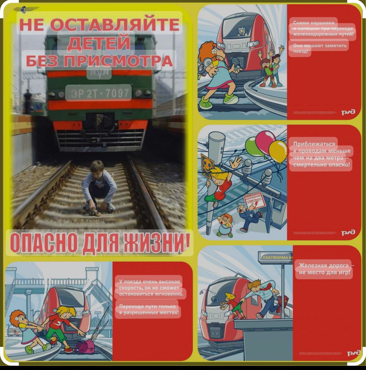 - не поднимайтесь на крыши вагонов поездов, опоры и специальные конструкции контактной сети, воздушных линий и искусственных сооружений, ведь напряжение в проводах достигает 27500 Вольт!