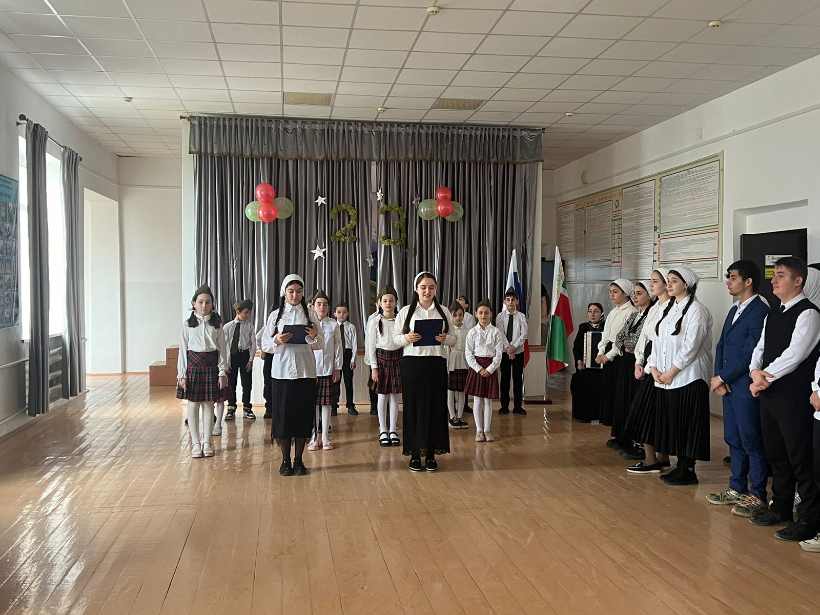 В соответствии с общешкольным планом ВР на 2023-2024 учебный год с целью патриотического воспитания школьников в школе проведено мероприятие, посвящённое Дню защитника Отечества.Учащиеся 4 класса вместе с руководителем хора «Домисолька» Народной артисткой ЧР Белаевой А.А. подготовили концертную программу