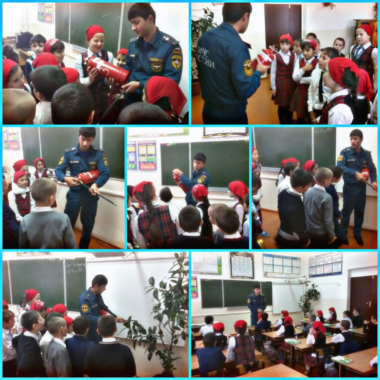 Темой занятия стали виды и использование первичных средств пожаротушения. О том, как и для чего использовать огнетушитель, детям рассказал сотрудник МЧС Садулаев А.С.