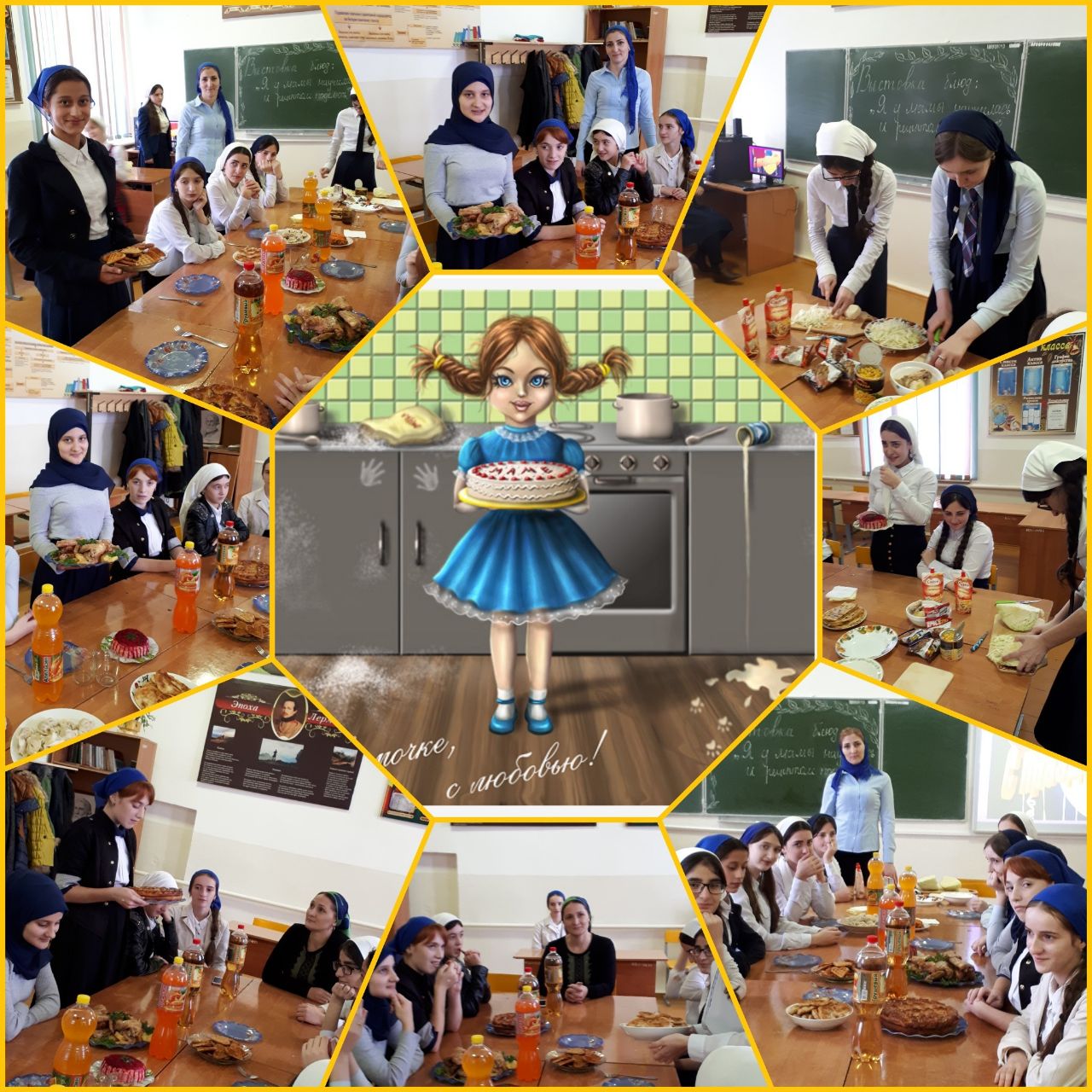 Выставку блюд "Я у мамы научилась и рецептом поделюсь" в 8 классе, организовала и провела учитель технологии Мадаева З.Д.