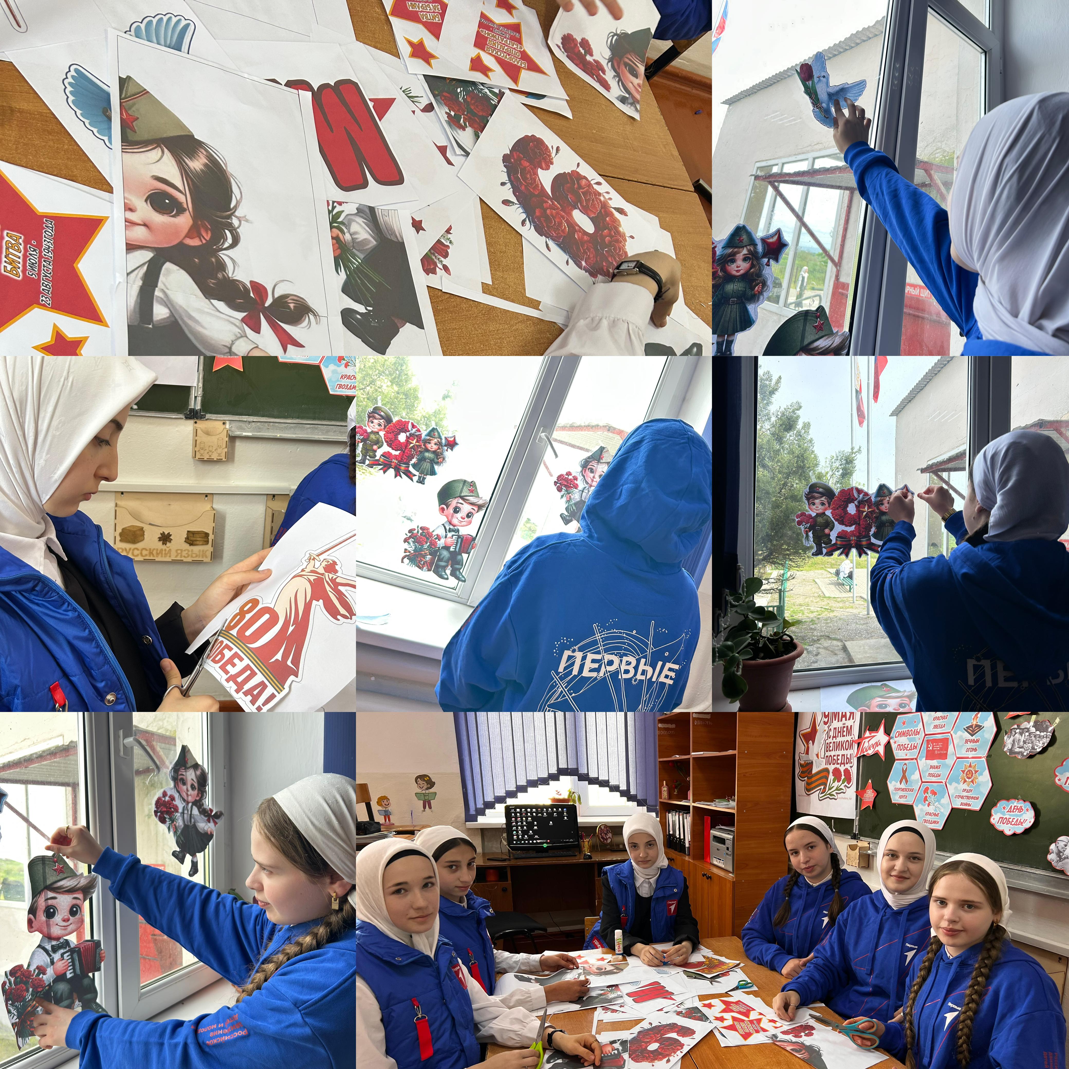 В преддверии Дня Победы учащиеся нашей школы приняли участие во Всероссийской акции «Окна Победы» . Ребята изготовили своими руками тематические украшения из бумаги: голубей, звёзды, георгиевские ленты, силуэты солдат, вечный огонь и символы мира. Работы украсили окна школы, превратив их в настоящие художественные композиции, наполненные уважением, благодарностью и памятью о подвиге героев Великой Отечественной войны!
