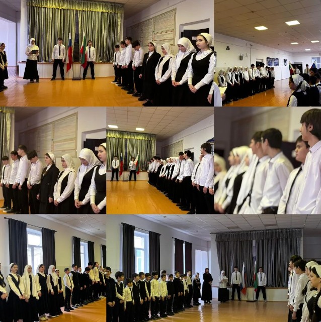 Перед началом занятий в МБОУ «СОШ №1 с.п. Горагорское» прошла еженедельная линейка, посвященная церемонии поднятия Государственных флагов Российской Федерации и Чеченской Республики под Государственные гимны.