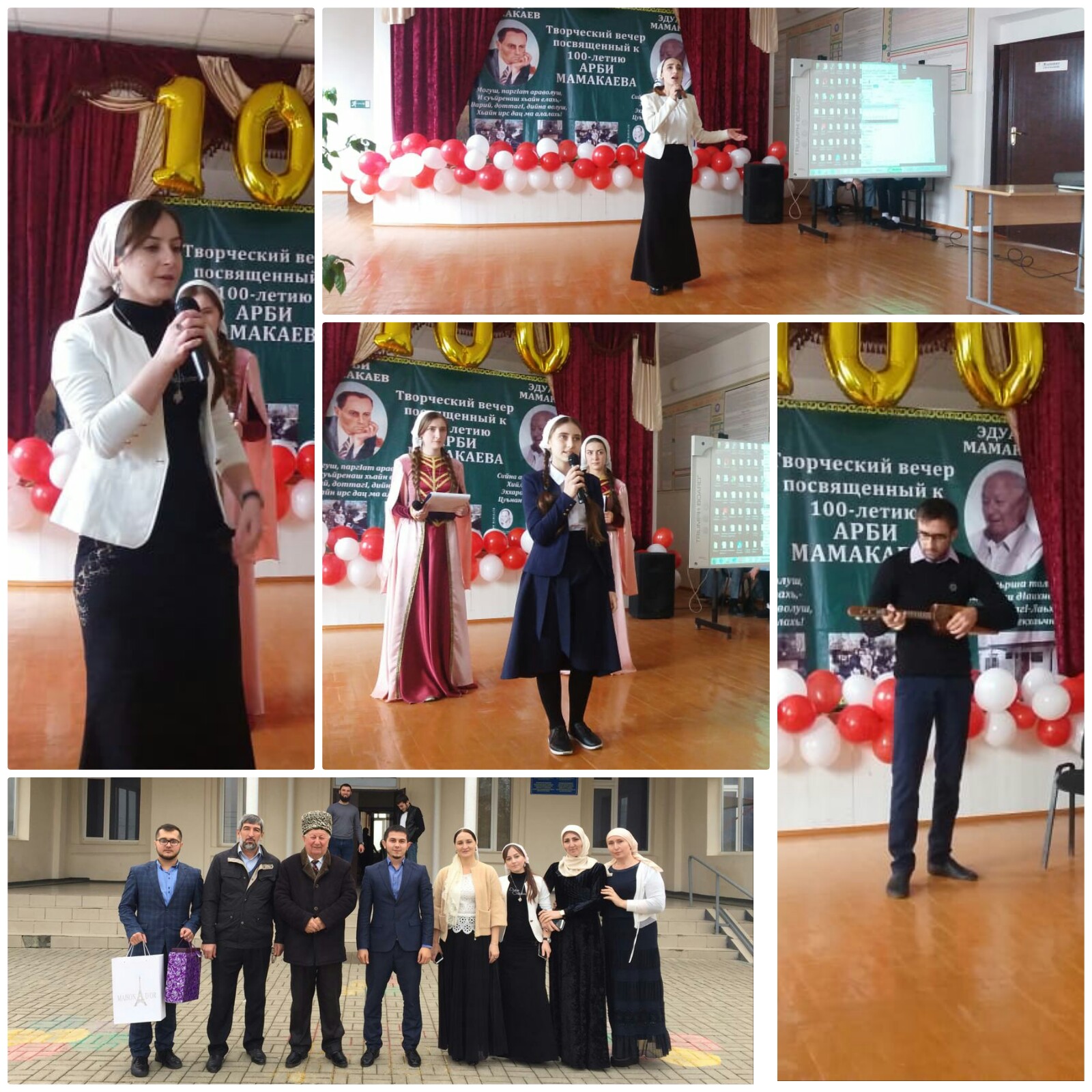Учащиеся, учителя встретили Эдуарда Арбиевича под громкие аплодисменты. Началось мероприятие, с литературно – музыкальной постановки, посвященной 100 - летию со дня рождения классика чеченской литературы Мамакаева Арби Шамсудиновича «Кавказ я был твоим…». Учащиеся читали самые известные стихотворения поэта на чеченском языке: «Бералла», «Рабфак», «Теркан тулг1енаш», «Лаха – Невре»,»Сарахь Теркан тог1ехь», «Цхьана йо1е», «1ожалла», «Даге», «Сайн к1анте». Были исполнены песни о любви к родному краю. Был продемонстрирован видеоролик, который до этого учительницей чеченского языка Баймурзаевой М. И. и учащимися 11 класса был снят в музее им. Арби Мамакаева. В видео было показано как, Эдуард Арбиевич проводит экскурсию для гостей, показывает более 2 тыс.экспонатов, рассказывающих не только об известном чеченском поэте и его литературном наследии, но и о быте и культуре, об историческом прошлом вайнахов, об участниках войн (земляках) со времен Первой мировой войны. Музей представляет собой жилой дом конца 19 века, в котором родился и вырос Арби Мамакаев, хозяйственная постройка, мемориальный сад с насаждениями, посаженными известными в республике писателями, учеными, деятелями культуры, общественными и государственными деятелями. Жилые комнаты и рабочий кабинет А.Мамакаева восстановлены в прежнем облике, какими они были при жизни поэта. Об этом хозяин дома рассказал приехавшим в гости и учащимся.